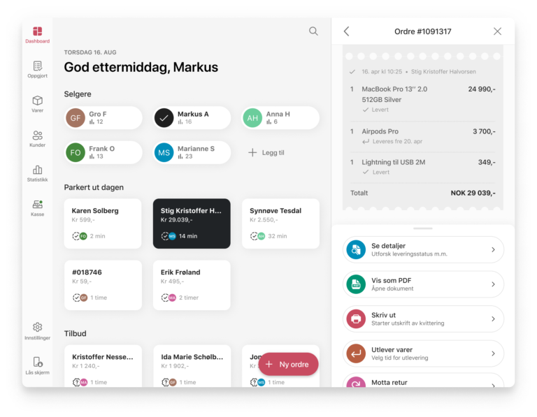 Få god oversikt over oppgjorte og parkerte ordre, sammen med kontinuerlig salgsoversikt for hver ansatt.